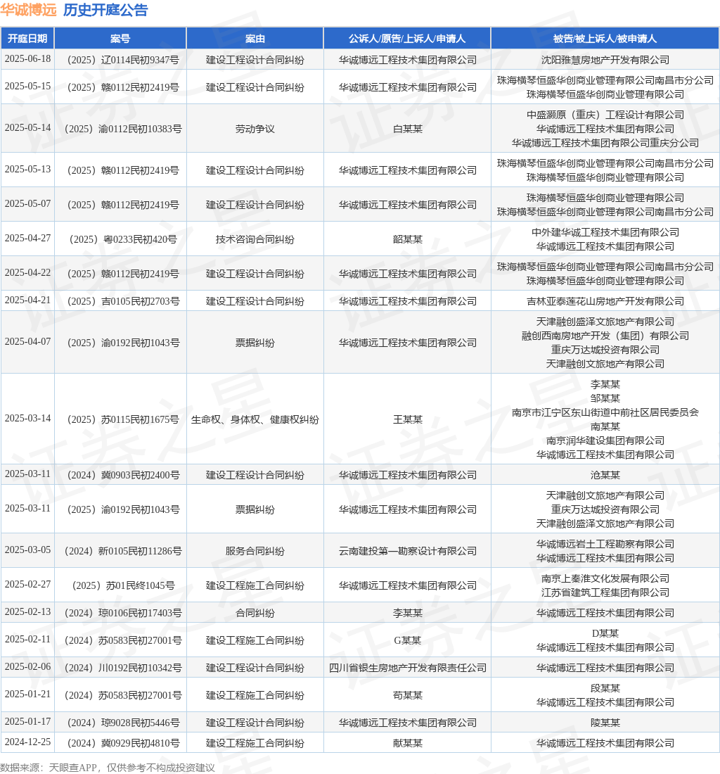 案号:(2025)赣0112民初2419号审理法院:南昌市新建区人民法院案由:建设工程设计合同纠纷当事人信息: 原告/上诉人:华诚博远工程技术集团有限公司 被告/被上诉人:珠海横琴恒盛华创商业管理有限公司南昌市分公司、珠海横琴恒盛华创商业管理有限公司开庭日期:2025年5月13日根据统计,近一年内以华诚博远工程技术集团有限公司为当事人的历史开庭公告有43则,其中案由为“建设工程设计合同纠纷”的公告以18则居首,其次为“建设工程施工合同纠纷”有6则,“合同纠纷”有3则。历史开庭公告(前20条)如下: